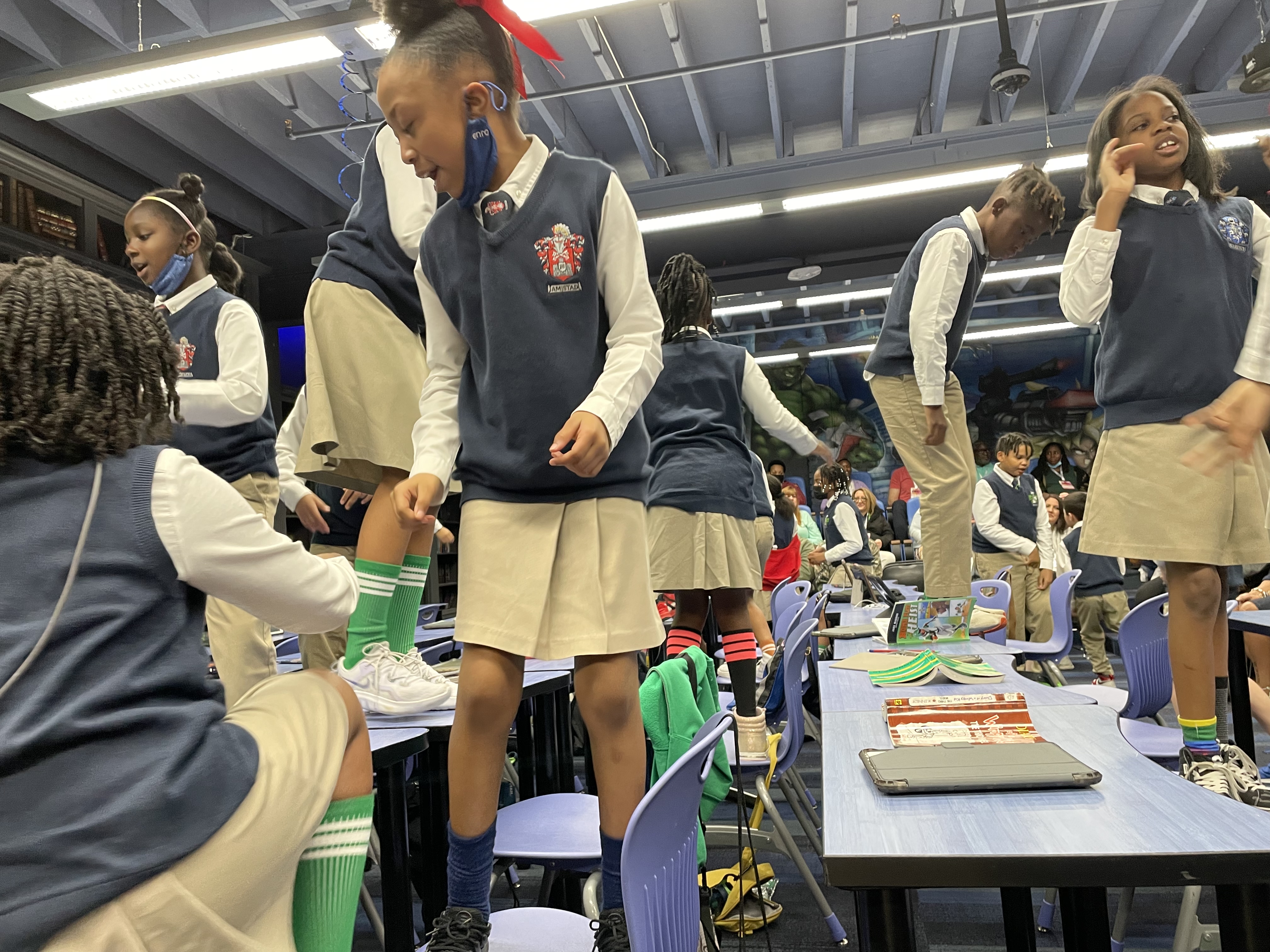 I don’t walk across desks in my classroom, and I haven’t found a used smoke machine (yet). But, I do have students act out their vocabulary words and scenes from a novel, and use improv to interpret a chapter in a book, and recreate paintings and give dialogue to the subjects in the painting. We do clear half the room for a month to build Rube Goldberg machines that go from ceiling to floor. We make snow cones in the depths of winter just for fun using the machine I got at a garage sale. We create projects to help improve the quality of life in our small community.