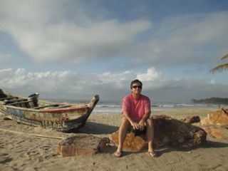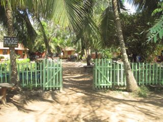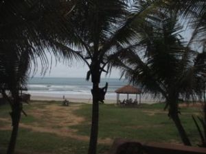All of us shared the beach house, formerly the home of the British couple (and their two kids) who ran the place. Apparently from the scuttlebutt we heard at the bar, this couple had put the place up for sale for 300,000 Euros and flown the coop a year ago to return to Britain. They still own the place but left a manager in charge along with a Ghanaian staff of 20 or so folks. It was evident that without the owners there to attend to the details, well, the details just weren’t attended to. Don’t get me wrong, it was still a magical place—miles of beach without a hotel, house, or person in sight (a few dogs and goats and an occasional sea turtle though), individual cabins/huts made of local materials and powered only by solar energy, the best bar ever featuring a surfboard with the Savior painted on it saying “Jesus Loves Cocktails,” gazebos on the beach where you could eat your meals,