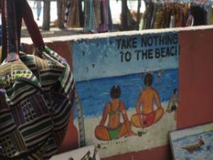 and the villagers were friendly “as long as you brought nothing with you.” Then it said, “For more details ask the receptionist.” So I headed to the reception building and asked the young Ghanaian man about the beach. Here’s how it went down: