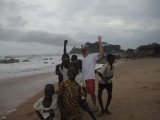 rain to have breakfast in the bar–French toast with grilled plantains. The rain eventually stopped and we walked a mile down the beach to a seaside shantytown village called Akwidaa where their shacks were no more than 10 feet from the ocean, and where a crowd of local kids (some of them butt naked, and not just the little kids) gathered to watch these crazy Americans. Obviously not too many tourists made it to this faraway place and I kind of liked that. Of course just when I thought I was at the edge of the world in a place untouched by time we passed a stand selling Coke and Twix bars. And then one of the kids started rapping some Jay Z song.