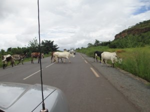 We set out in a caravan of 3 vehicles at 10AM Friday morning, with a quick stop at the travel agency to pay for our tickets to Ghana for fall break next month. We appeared to be the only non-black people on the streets of this city of 2 million people so we were a bit of a spectacle. Since Jamey and I haven’t left Bamako since we arrived 44 days ago it was quite interesting to see how different it looked outside of the city proper. There were 4-lane highways with a concrete median, almost like we would see back home. Well except there was an occasional random donkey or long-horned steer standing on the concrete median in the middle of all that speeding traffic. And guys walking into the highway with what I thought were plastic tennis rackets except they were electrified devices for zapping flies (note to self: buy one of these for our roof deck ASAP). And there really aren’t “lanes” of traffic per se. While there are painted lines in the center these are ignored and sometimes there is just one big lane and sometimes they create 3 or 4 lanes when the motos squeeze in there (BTW, our group discussed what we saw the moto drivers carrying and this included: a stack of 10 chairs, two pelicans—which I might add are not birds that live within 1000 miles of Bamako, and a stack of tires with the driver playing the peg of a ring toss game).