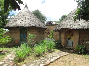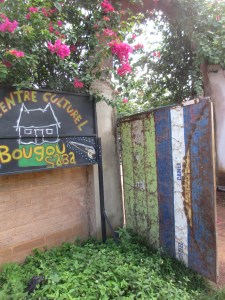 A half mile down the road, through a field with donkeys grazing, was the entrance to our encampment, Centre Culturel Bougu Saba, which I believe means “huts without running water.” The French owner threw open the metal gates which were framed by fuchsia bougainvillea, and we all drove in. It was actually beautiful—rustic, but picturesque. There were indeed a series of mud brick huts with thatched roofs and doors painted with African figures. But they were charming. Inside each were two beds canopies of mosquito netting, mosaic tile floors, and an overhead fan. The rest of the compound included a little bar and covered eating area, a large open-air multipurpose area with huge peaked thatched roof and carved wood pillars, and a bathroom area with composting toilets (you can Google it).
