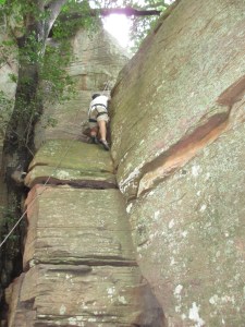 After lunch we had some options: rock climbing, hiking, or watching the rock climbers. Obviously the last option sounded attractive to us, but a colleague said it was just a short romp on an easy trail to get to the TOP of the arch where the view was even MORE impressive. We thought that sounded good and followed them to the “easy trail” that didn’t seem to be a trail at all, but areas of 4-foot tall grasses that surely were hiding various species of poisonous African snakes and such. But we kept moving on. Then it was up a mini-cliff of sharp rocks that didn’t seem to be secure, and up another little cliff that required us to wedge our shoe into tiny notches on a branch to propel ourselves upward. Then it was through a crevice in the rocks that I swear if I had eaten one more Pringles I would not have fit. After some more twists and turns that I didn’t pay too much attention to (more on that later) we came to a steep rock wall face that we shimmied up.